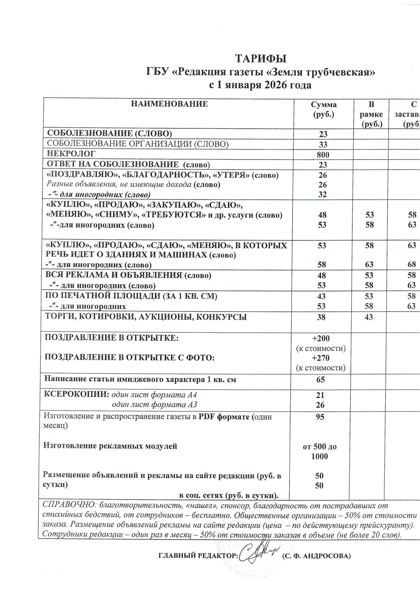 Тарифы газеты «Земля трубчевская» с 1 января 2026 года
