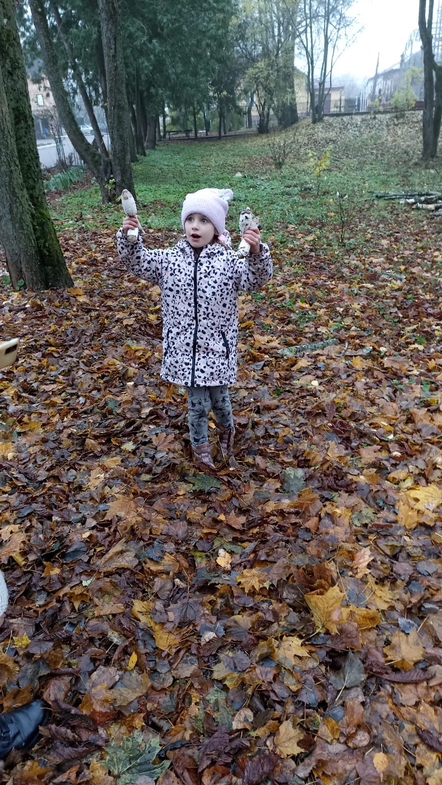 «Если вы подумали, что это лесные дары, то вы ошиблись, – пишет С. Н. Куликова. – В руках у нашей внучки Аннушки – осенние сюрпризы нашего парка! Кстати, вполне съедобные. Такой урожай грибов Анюта собрала во время прогулки в парке, отлучившись на пару минут – «за каштанами».