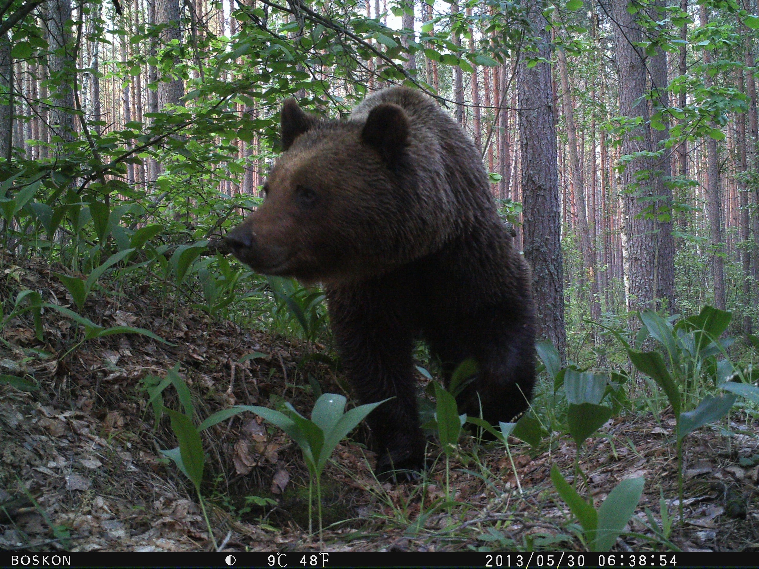 Они живут на довольно обширных по площади участках. По сути, вся территория заповедника в двенадцать тысяч гектаров – это всего один-два участка бурого медведя. Если мерить гектарами, то у крупных самцов, доминантов, которые являются основными производителями на этой территории, есть свой индивидуальный участок, который они в течение года проходят, осваивают. Такой участок может занимать от пяти до десяти тысяч гектаров. А вот самке с медвежатами достаточно трех-пяти тысяч гектаров. Дело в том, что у бурых медведей все участки перекрываются: внутри участка самца-доминанта может жить несколько самок, как с медвежатами, так и холостых, еще молодых. По краям могут примыкать и участки молодых самцов, которые вглубь не заходят. Всех этих медведей я условно называю «нашими», заповедническими. Причем плотность медведя держится на оптимальном уровне, и она таковой будет оставаться. Другие, как бы «лишние», медведи постоянно уходят куда-то дальше. В последнее время в Калужской области встречаются медведи, в Тульской. Я допускаю, что они в том числе и из наших брянских лесов.