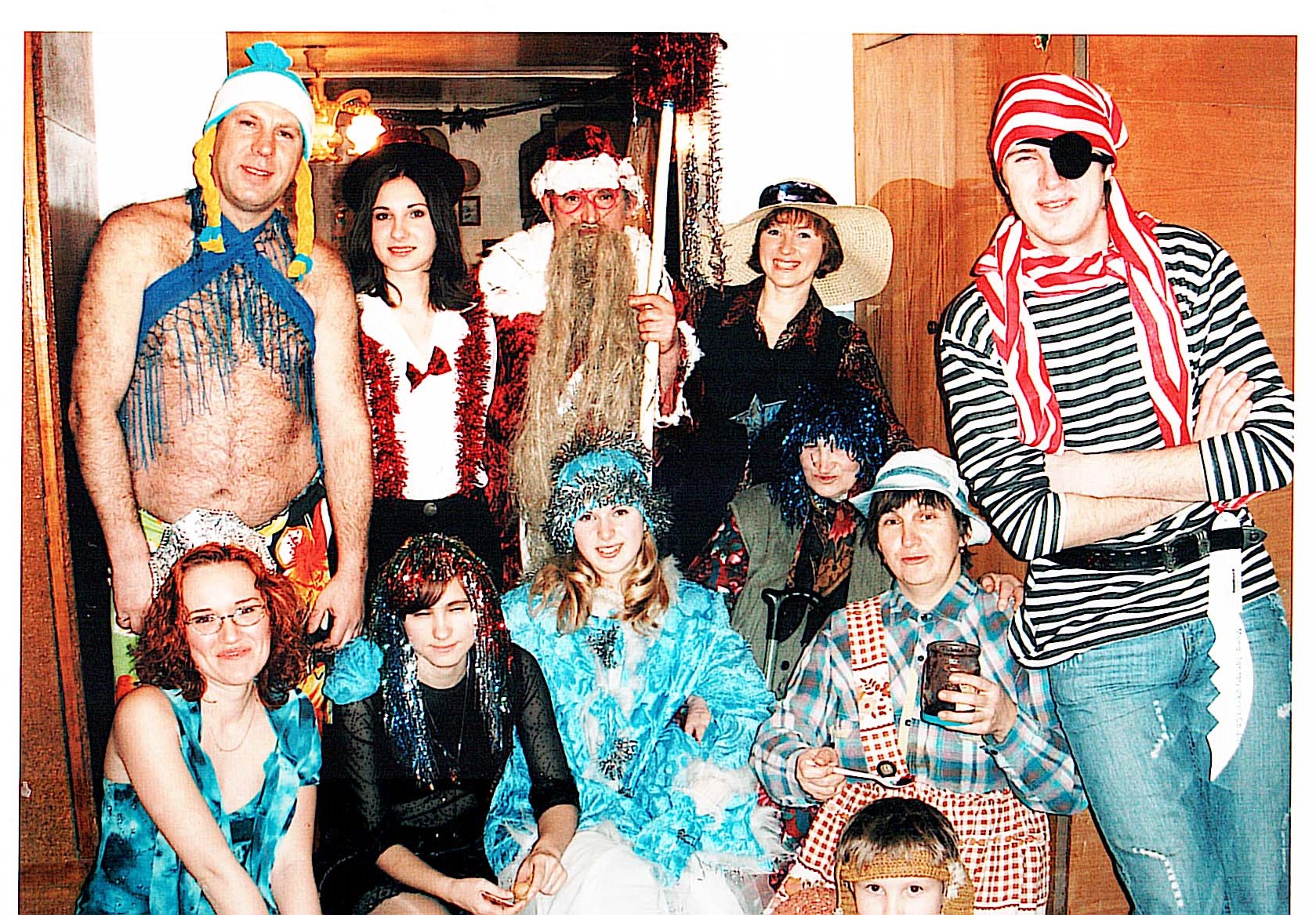 1. «Семейный маскарад». В 2000 году на семейный новогодний праздник в дом бабушки и дедушки: Ольги Ива-новны и Василия Анатольевича Сергеевых – вход был открыт «только в маскарадном костюме» (Фото №1). Сестра главы семейства с супругом и детьми, дочери Сергеевых, гости из Смоленска, крестник с удовольствием перевоплотились в сказочных персонажей. Кто только ни пожаловал тогда на их семейный новогодний огонек к Деду Морозу (в которого превратился на время Василий Анатольевич): и сластена Карлсон (с личной банкой клубничного варенья), и нарядная фея Добра, и нежная Снегурочка, и маленький забавный Щенок, и классические Снежинки, и грозный, но добрый Пират, и даже улыбчивый африканский «Сне-гурОк». Стоит ли, говорить, насколько весело и интересно большая семья встретила Новый год начала века.