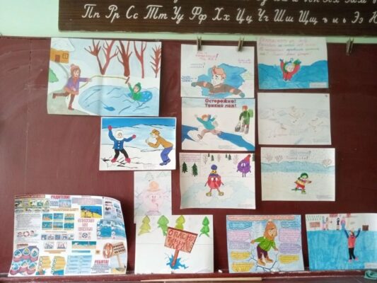 Так, в 3 классе (классный руководитель – О. А. Радченко) было проведено внеклассное мероприятие «Первый лёд самый опасный!», на котором ученики посмотрели видео и обсудили с учителем вопросы безопасного поведения у водоёмов в холодное время года. Ребята узнали, что категорически запрещается проверять прочность льда ударом ноги, так как есть риск провалиться под лёд. Во время оттепели на лёд выходить опасно. Не следует спускаться на лыжах и санках с обрывов – у берега лёд особенно тонкий. Осторожным следует быть и в местах, где быстрое течение, где ручьи впадают в водоёмы, выходят родники, вливаются сточные воды промышленных предприятий. Тёмное пятно на ровном снеговом покрове тоже таит опасность: под снегом может оказаться непрочный лёд. Кататься на коньках разрешается только на специально оборудованных катках