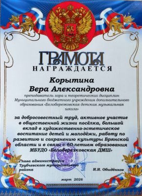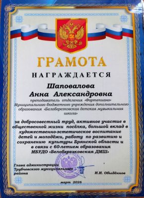 Гадзевич и Анна Александровна Шаповалова, отделения «Хоровое пение» — Людмила Михайловна Лунёва, отделения «Народные инструменты» — Вера Александровна Корытина, — награждены Грамотами главы администрации Трубчевского муниципального района «За добросовестный труд, активное участие в общественной жизни посёлка, большой вклад в художественно-эстетическое воспитание детей и молодежи, работу по развитию и сохранению культуры Брянской области и в связи с 60-летием образования МБУДО «Белоберезковская ДМШ».