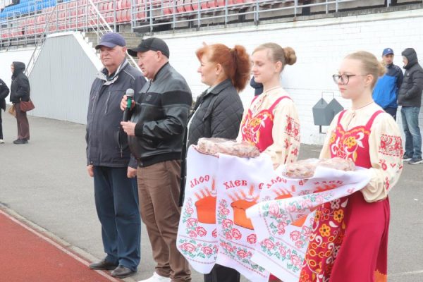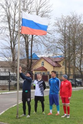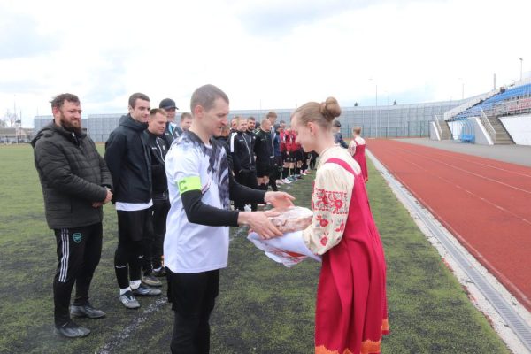Честь поднять государственный флаг предоставили капитанам команд. Футболисты, почетные гости спортивного праздника: глава района В. В. Евсеев, главный специалист отдела культуры, ФК и архивного дела Н. И. Родькина, директор Трубчевской спортшколы О. Е. Пулин и главный судья турнира Г. П. Астапенко, — а также болельщики на трибунах и трубчане, проходящие мимо стадиона в парк на прогулку, замерли, наблюдая, как под звуки Государственного гимна Российской Федерации полотнище триколора торжественно поднялось в небо, расправилось, затрепетало на апрельском ветру. Девушки-волонтеры, активистки «Движения первых» Трубчевского района, по доброй традиции преподнесли капитанам пышные караваи.