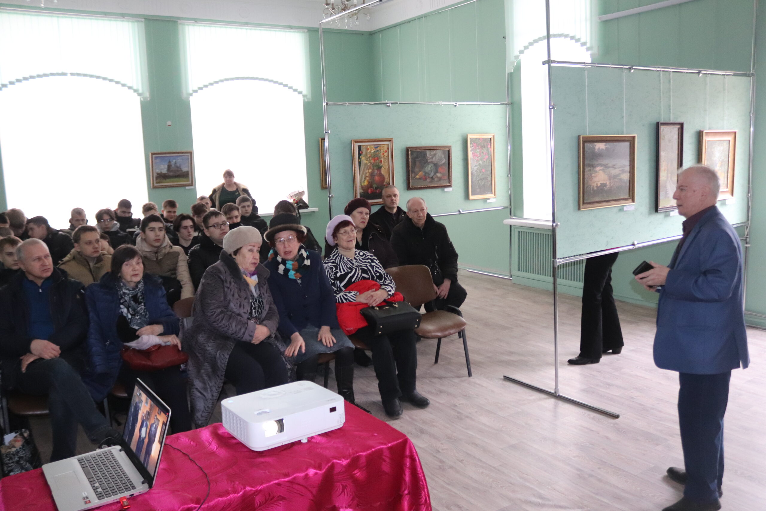 Михаил Сергеевич поведал собравшимся в помещении выставочного зала (стены и стенды которого украшали его картины) студентам политехникума, жителям и гостям города о своем творческом пути, рассказал об истории создания некоторых картин, иллюстрируя рассказ презентацией – фотослайдами своих картин и личных фотографий, ответил на вопросы «из зала».