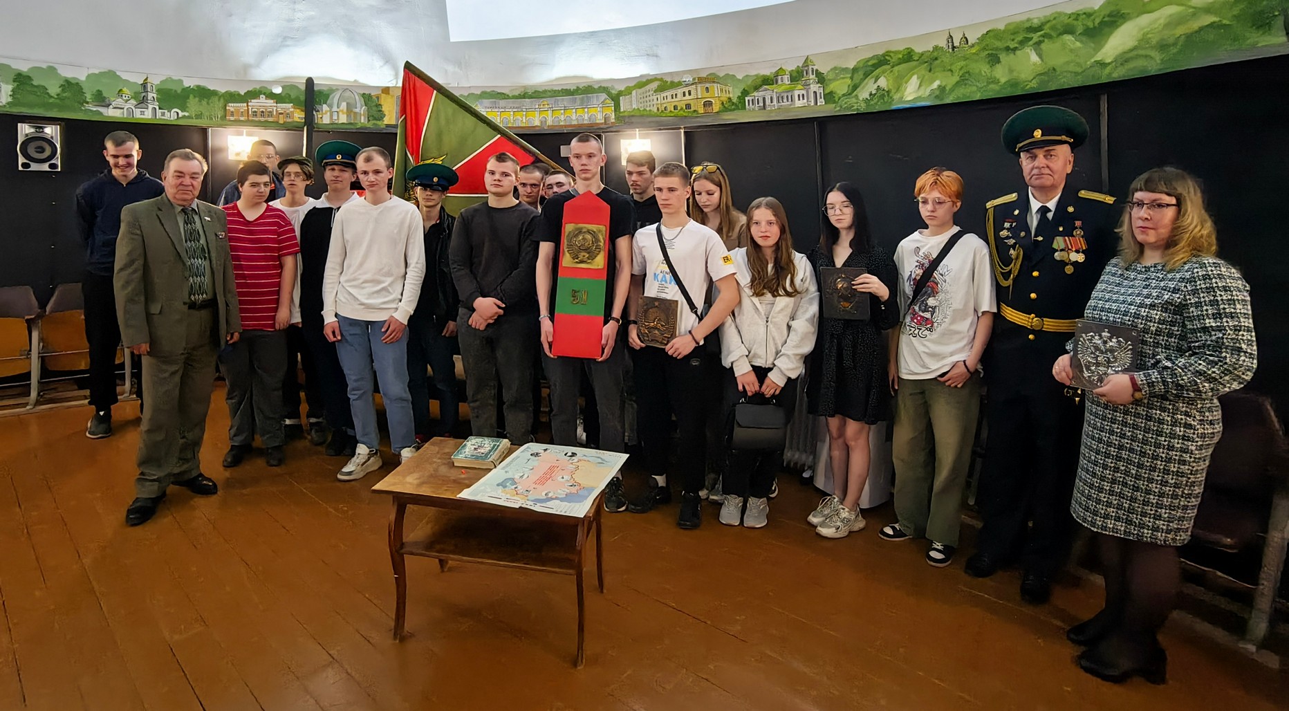 Подполковник А. Е. Головач рассказал о своей службе, продемонстрировав множество интересных экспонатов: флаг пограничников, учебники времен СССР, карту границ Советского Союза с военными округами, гербы на пограничных столбах СССР и Монголии, а также пограничные фуражки и пилотки.